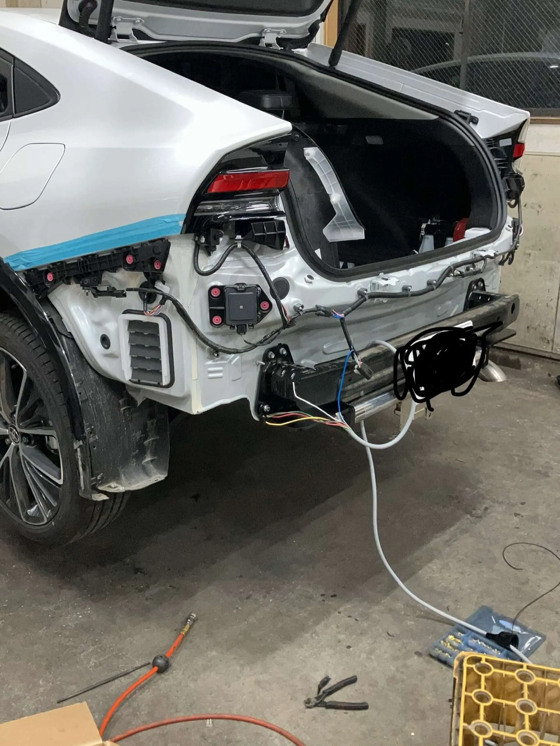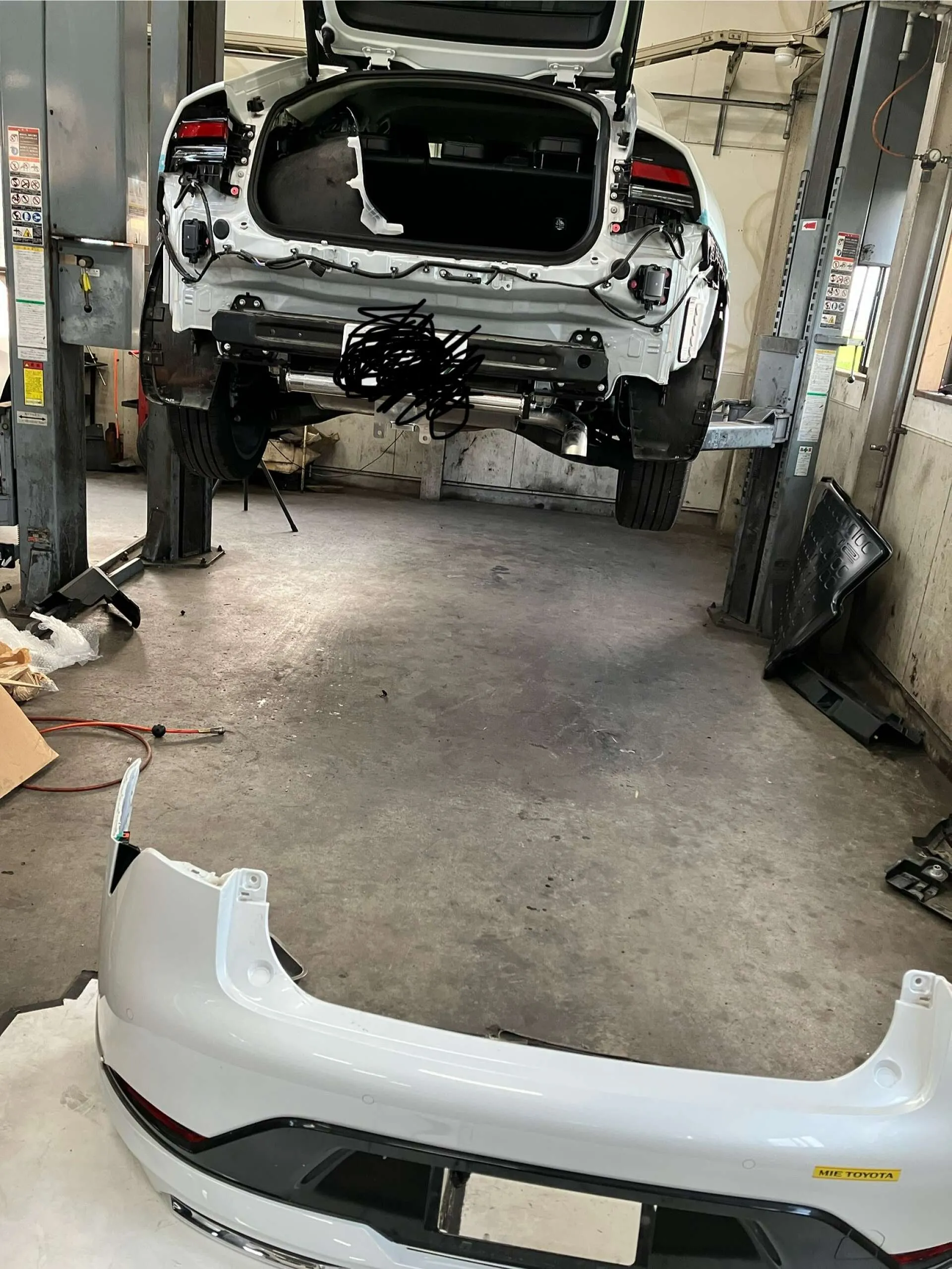 リフトで持ち上げられた車両と、外されたばかりのリアバンパー。